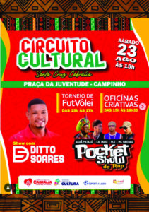 A Secretaria de Cultura da Cidade de Santa Cruz Cabrália, organiza o Circuito Cultural que acontecerá na praça da Juventude – Campinho, no dia 23 de agosto (sábado) às 15 h, com diversas atividades esportivas, culturais e de empreendedorismo social.