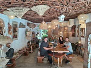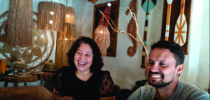 Tatiane – Psicóloga na cidade de Itabuna ao visitar o irmão estando de férias, apaixonou-se pela atividade. Tendo sido técnica em enfermagem, com trabalhos prestados em hospitais no período de 13 anos, não precisou beber ou lavar os pés na fonte da Santa, como reza a lenda urbana de Arraial d’Ajuda (Pois quem lava os pés, ou bebe da água da fonte dos Jesuítas na fonte que flui por baixo da escadaria da Igreja da N. As d’Ajuda, fica tão apaixonado por Arraial que não volta pra sua cidade de origem, ou se voltar só sossega depois de retornar pra ficar definitivo). A princípio eram férias de 1 mês, passaram para 2 meses, e para dar sequência aos atendimentos clínicos na cidade de Itabuna, passou a atender on line, Herbert convidou a irmã para atuar na administração enquanto ele poderia se dedicar mais na criação e produção. Assim sendo, deu muito certo, com a Psicóloga de corações e mentes também se tornando de fios e fibras, compondo a grande tapeçaria da vida humana. Onde podemos dizer que a psicóloga formada, faz sua própria terapia criando e tecendo formas extraídas da alma ( Como revela a fotografia sorridente espontânea de ambos). Num convite para se viver no estilo Sul da Bahia.